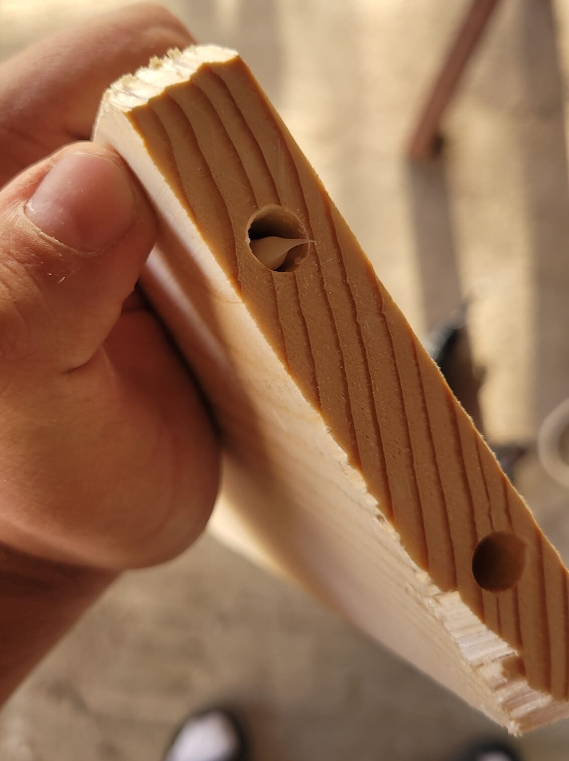 Cu dispozitivul minune, opritorul pe burghiu și toate așezate, dăm găuri pentru introducerea adezivului și diblului de lemn. Că am uitat să zic, dacă folosiți opritorul pe burghiu, țineți cont și de grosimea dispozitivului la montaj.